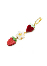 En los rincones secretos del bosque, donde las flores se mezclan con fruta madura, vive una ninfa que no camina: recolecta. Frambuesas, fresas, pétalos. Todo cuelga de sus orejas como si el verano le hubiera escrito una carta.
