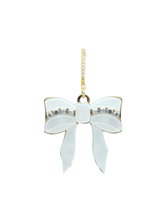Materiales y acabado: metacrilato blanco nacarado; cristales plateados; fornituras en plata de ley 925 bañada en oro amarillo 24K.