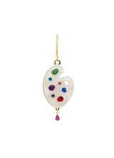 Materiales y acabado: pendiente inspirado en una paleta de pintura, elaborado en metacrilato blanco nacarado con espejo de colores, aplicaciones de cristal y gota fucsia en plata bañada en oro. Montado sobre una base de chapa bañada en oro de 24K. Cierre en plata de ley 925 bañada en oro amarillo con circonitas.