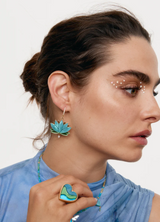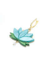- Colores: : metacrilato azul nacarado y espejo verde con colgante de circonita blanca en una base de chapa bañada en oro de 24K.