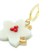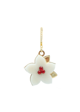 Materiales y acabado: pendiente Tiny con diseño floral en metacrilato, decorado con aplicaciones de cristal y montado sobre una base bañada en oro de 24K. Fornituras en plata de ley 925 bañada en oro amarillo de 24K.