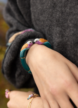 Brazalete de porcelana, cuentas de cristal y bañado en oro. Metal certificado libre de níquel hipoalergénico.