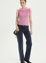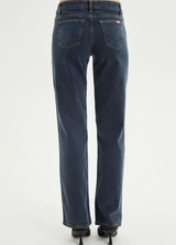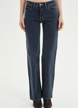 Jean tiro bajo de denim azul oscuro. Tiene corte recto y costuras a contratono. Cómodo y versátil: un clásico para usar todos los días.