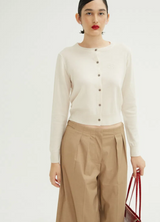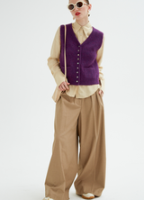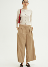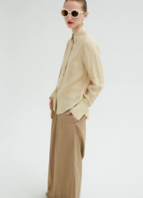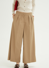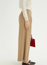 Pantalón sastrero tiro bajo con botamanga ancha y cintura regulable que se cierra con un broche interno escondido. Tiene dos pinzas delanteras en cada pierna y bolsillos en los laterales.