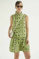 Short sastrero 100% algodón color verde con estampados geometricos, tiro alto, con pinzas que ciñen la cintura para un calce cómodo y favorecedor. Además, la cintura tiene un cinto elástico rayado colores verdes y negro que le suma un toque sporty y moderno. Relajado, cool y con un fit impecable! Completa el look con la