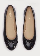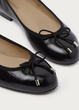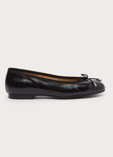 Las bailarinas Emilia en piel de vacuno con grabado efecto cocodrilo en color negro. Son perfectas para un look elegante gracias a su punta redondeada, además en la parte superior llevan un lazo con detalles metálicos en dorado. Están confeccionadas en suave piel de vacuno con un diseño atemporal que garantiza comodidad y elegancia sin esfuerzo. Una opción versátil para realzar tu look diario y agregar un toque refinado a cualquier outfit. Diseñadas y fabricadas integralmente en España.