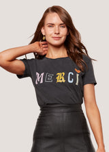 Merci captura la gratitud en una polera que combina juego tipográfico y colorido. El mensaje delantero "Merci" se despliega en letras de distintas tipografías y tonalidades, creando un efecto dinámico y chic que refleja el espíritu estiloso y positivo de la marca. Diseñada en España y confeccionada en Portugal en 100% algodón orgánico, esta prenda fusiona la filosofía slow fashion con una estética fashion-forward. Perfecta para looks urbanos y casuales que exudan personalidad, es también uno de nuestros best sellers icónicos, pensado para durar y convertirse en un clásico de la colección.