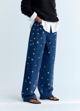 Un elegante pantalón denim de pierna ancha con delicados detalles de cristales aplicados a mano en la parte delantera que le aportan un sutil toque de brillo. Diseñado por la firma española The New Society con bolsillos de parche en la espalda y rematado con bordado TNS en la cinturilla, combina comodidad informal con detalles refinados y únicos.