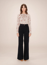 SCARLETT es blusa estampada de Grace & Mila con una silueta recta con mangas largas y puños elásticos; escote en V con dos lazos delanteros y cuello fruncido con volantes. Estampa floral setentera; bajo redondeado. Ideal para looks bohemios y femeninos.