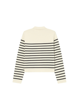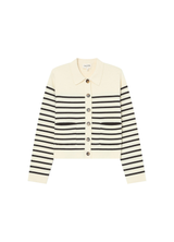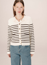 SAILOR es cárdigan de punto Milano de la firma francesa Grace & Mila , corte recto y manga larga; cuello camisero, cierre frontal con botones y bolsillos de parche. Disponible en versiones lisas o a rayas; 40% poliéster, 31% acrílico, 23% nailon, 6% lana.