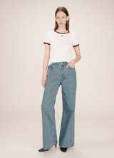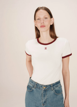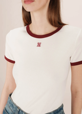 SANY es una camiseta de punto de algodón de Grace & Mila con corte entallado; cuello redondo y ribetes acanalados en contraste. Monograma G&M bordado en la parte delantera. 92% algodón, 8% elastano; Silueta ajustada y deportiva con toque retro.