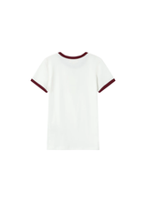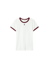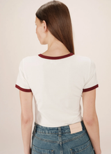 La camiseta SANY es una pieza clave de la colección, con inspiración retro y deportiva. Con corte entallado, manga corta y cuello redondo, destaca por el monograma G&M bordado en la parte delantera y por los ribetes acanalados en contraste en el cuello y los bajos de las mangas. Confeccionada en suave jersey de algodón con un 8% de elastano para un ajuste cómodo y una silueta favorecedora.
