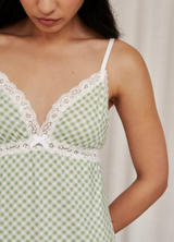 Camisola Gingham Green con encaje delicado en escote y bajo busto. Tirantes ajustables para un ajuste personalizado y un soporte cómodo. Hecha íntegramente de algodón Pima; suavidad y libertad de movimiento para noches de verano.