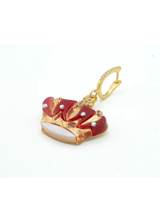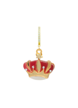 Materiales y acabado: pendiente con diseño de corona real, elaborado en metacrilato rojo marmolado, detalles tipo espejo dorado y aplicaciones de cristal. Montado sobre una base en chapa bañada en oro de 24K. Fornituras en plata de ley 925 bañada en oro amarillo de 24K.