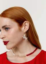Materiales y acabado: pendiente con diseño de unicornio real, elaborado en metacrilato blanco marfil con acabado marmolado, detalles tipo espejo y aplicaciones de cristal rojos y verdes. Montado sobre una base en chapa bañada en oro de 24K. Fornituras en plata de ley 925 bañada en oro amarillo de 24K con circonitas.