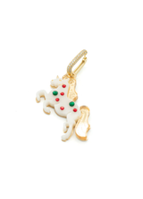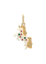 El unicornio del escudo británico cambió la armadura por brillo. En este pendiente, sigue siendo símbolo de nobleza, pero con un toque más descarado: menos protocolo, más purpurina. Una joya que celebra la fantasía con el porte de una reina que sabe divertirse.