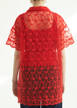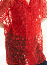 Camisa oversize manga corta, con cuello con solapa y botones en forma de flor perlados que le suman un toque cute y romántico. Está confeccionada en una tela traslúcida con bordado floral y tiene terminaciones onduladas en mangas y ruedo que la hacen aún más especial. Ideal para superponer, jugar con texturas y elevar cualquier look!