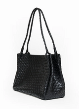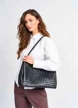 Nox es un bolso de hombro grande, versátil y funcional, tejido a mano en cuero trenzado de alta calidad con nuestro icónico punto. Combina una base estructurada que garantiza firmeza con un interior forrado en algodón y un práctico bolsillo. Su cierre magnético aporta comodidad y seguridad sin comprometer la elegancia. Con gran capacidad para todo lo que necesitas.