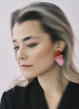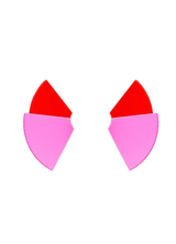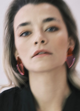 Aros en metacrilato con un diseño que evoca coquetería y teatralidad con una presencia contenida. El metacrilato aporta transparencias y destellos de color, mientras el latón bañado en oro 18k confiere un brillo cálido y duradero.
