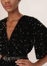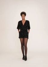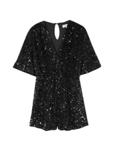 El mono THALASSA es una pieza imprescindible en el vestuario festivo de la Casa. Elementos como el escote en V, la apertura de la camisa abotonada en la parte trasera y las mangas cortas tipo mariposa realzan la silueta con elegancia y sencillez. Elaborado con terciopelo con lentejuelas, el mono THALASSA tiene una cintura elástica, bolsillos laterales y forro completo.