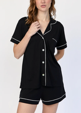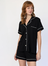 Clásico, simple y refinado. Nuestro conjunto de pijama corto estilo boyfriend en color negro resalta la suavidad de la mezcla de algodón Pima y modal, creando una sensación delicada sobre la piel. Esta combinación única de fibras, mejorada con un tratamiento especial de lavado, garantiza una calidad excepcional y una durabilidad duradera. El acabado de lujo proporciona un tacto más suave y una caída sutil, ofreciendo una experiencia de confort realmente distintiva.