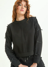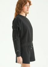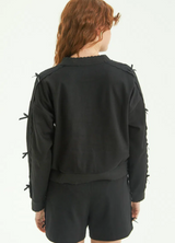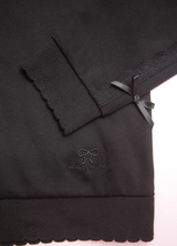 Un básico con un twist romántico. De corte recto y relajado, llega hasta la cadera y tiene cuello redondo, puños y ruedo en ribb con un acabado ondulado súper delicado. Lo mejor: las mangas tienen tiras de encaje con moños de cinta satinada que lo hacen único, y bordado a tono en el frente el logo de Las Pepas con un moñito. Ideal para usar con el Short Nyla en conjunto o para darle un toque romántico a cualquier look casual.