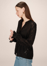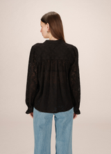 SWING es una blusa de encaje recta, con puños volantes y ribete de encaje; un toque romántico para looks de moda europea.