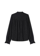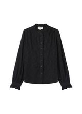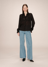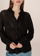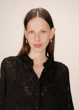 SWING propone una estética refinada y atemporal con su encaje delicado y línea limpia. La firma Grace & Mila aporta su sello francés de lujo discreto, creando una prenda que funciona tanto con pantalones, como con jeans para un look femenino y relajado. Detalles como la abertura frontal abotonada, el cuello redondo y el fruncido en hombros y canesú trasero elevan la blusa a una pieza de storytelling editorial.