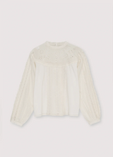 Delicada y elegante, esta blusa de batista de la firma española The New Society presenta un canesú bordado, volantes y elaborados detalles de encaje en el cuerpo y las mangas. Una abertura en forma de cerradura en la espalda con un botón a tono le da un toque final sutil y refinado.