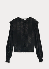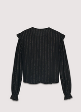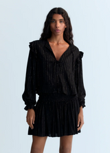 Elegante y ligera, esta blusa de viscosa de The New Society luce un sutil brillo de lúrex que le da un toque refinado. Diseñada con una abertura frontal que se cierra con un lazo y un botón, y rematada con un delicado detalle de volante en los hombros. Combínala con la falda a juego para un look total sofisticado.