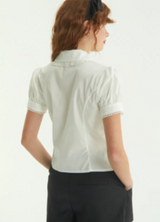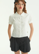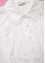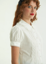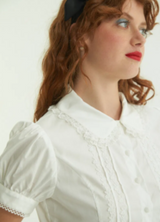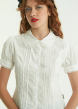 Romántica, delicada y con detalles que enamoran. Camisa corta hasta la cadera, confeccionada en poplín de algodón. Tiene mangas cortas tipo balloon con terminación picot y cuello redondeado y borde de encaje que suma ese toque vintage que amamos. Sus pinzas que entallan la silueta y te entregarán un calce perfecto, tiras de encaje decorativo y botones en forma de rosa.
