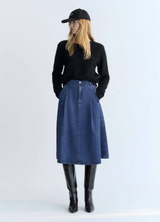 Esta clásica falda denim larga presenta una favorecedora silueta en A con detalles plisados tanto en la parte delantera como en la trasera, que le aportan un sutil movimiento y estilo. Parte de la nueva colección de la firma española The New Society. Una prenda versátil, perfecta para cualquier temporada.