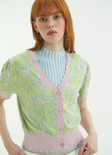 Cardigan manga corta tejido en jacquard con motivo floral y textura liviana. De corte recto y largo hasta la cadera, tiene mangas tipo balloon y terminaciones onduladas en cintura, mangas y cartera. Los botones, en forma de flor traslúcida, le suman un toque romántico. Confeccionado en una mezcla liviana de viscosa y nailon, es ideal para sumar color y textura a tus looks de todos los días.