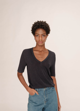 La camiseta Taylor de la firma francesa Grace & Mila es una prenda esencial que eleva el armario con un toque de luminosidad gracias al lúrex. Su corte recto y mangas cortas crean una silueta limpia y moderna, mientras el escote en V pronunciado aporta un aire femenino y elegante.
