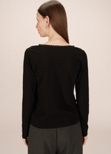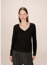 SELTON es un top de manga larga con cuello en V y un sutil ribete de lúrex que realza el escote con un brillo discreto. Una pieza básica de Grace & Mila, fácil de combinar y llevar durante toda la temporada.