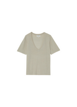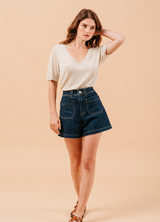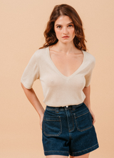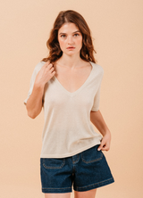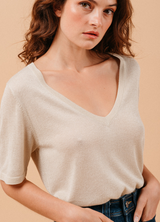 MISS es un top con escote en V y manga corta en tejido de lúrex. Corte recto.
