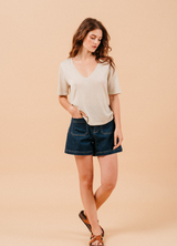 ¿Cómo llevar una camiseta de lúrex? En Grace & Mila, el top de lúrex de MISS se combina con shorts, un look femenino y casual que nos encanta llevar a diario. El top MISS es una prenda fácil de llevar que nos gusta combinar con casi todo y que aporta un toque de brillo y elegancia a cada outfit.