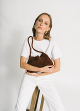 Para conservar la calidad de tu bolso Min Musá debes evitar transportar objetos excesivamente pesados para que así no se deforme la forma del bolso. También evite la exposición directa y prolongadas a fuentes de luz y calor, ya que al ser gamuza con tintes naturales podría perder la intensidad de su color.