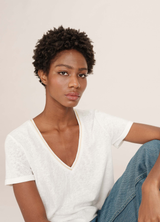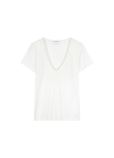 El top de manga corta TIM es un imprescindible atemporal de la Maison. Las lineas clásicas del modelo se adaptan a las curvas de cada mujer. El escote en V del top recto TIM está realzado con un ribete de lurex que resalta el escote y añade un toque de feminidad a la prenda.